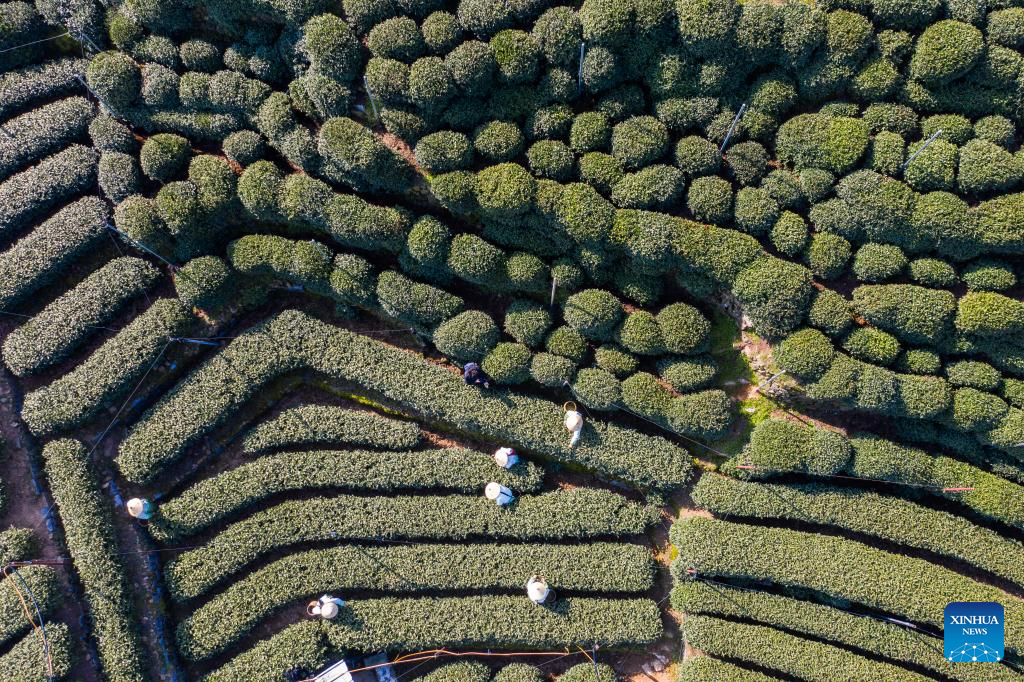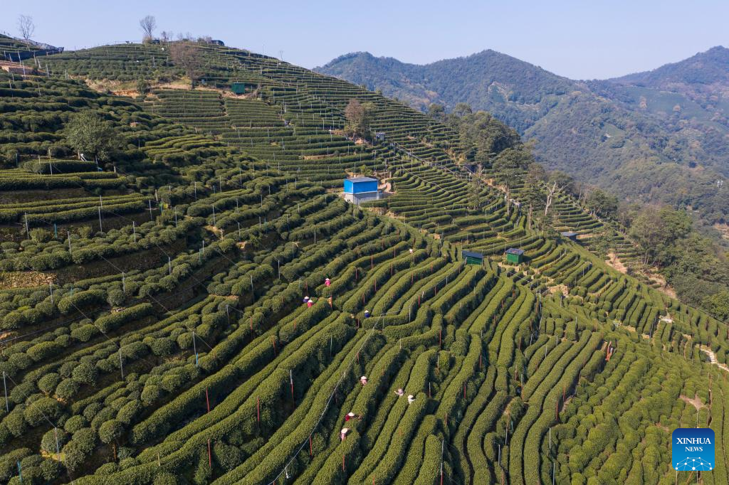 An aerial drone photo shows tea farmers picking this year's first batch of West Lake Longjing tea in Wengjiashan Mountains, the first-class protected area of West Lake Longjing tea base, in Hangzhou, east China's Zhejiang Province, March 20, 2025. (Xinhua/Xu Yu)