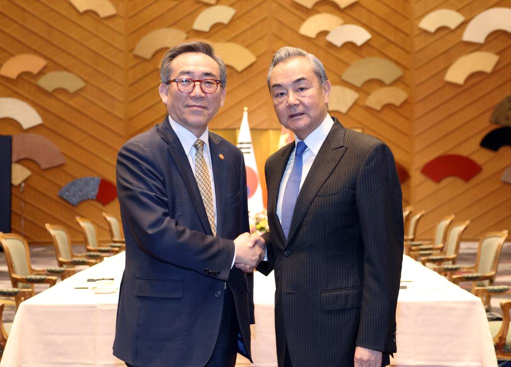 Chinese Foreign Minister Wang Yi (R), also a member of the Political Bureau of the Communist Party of China Central Committee, shakes hands with Cho Tae-yul, Minister of Foreign Affairs of the Republic of Korea (ROK), during their meeting ahead of the 11th China-Japan-ROK Trilateral Foreign Ministers' Meeting in Tokyo, Japan, on March 21, 2025. (Xinhua/Jia Haocheng)