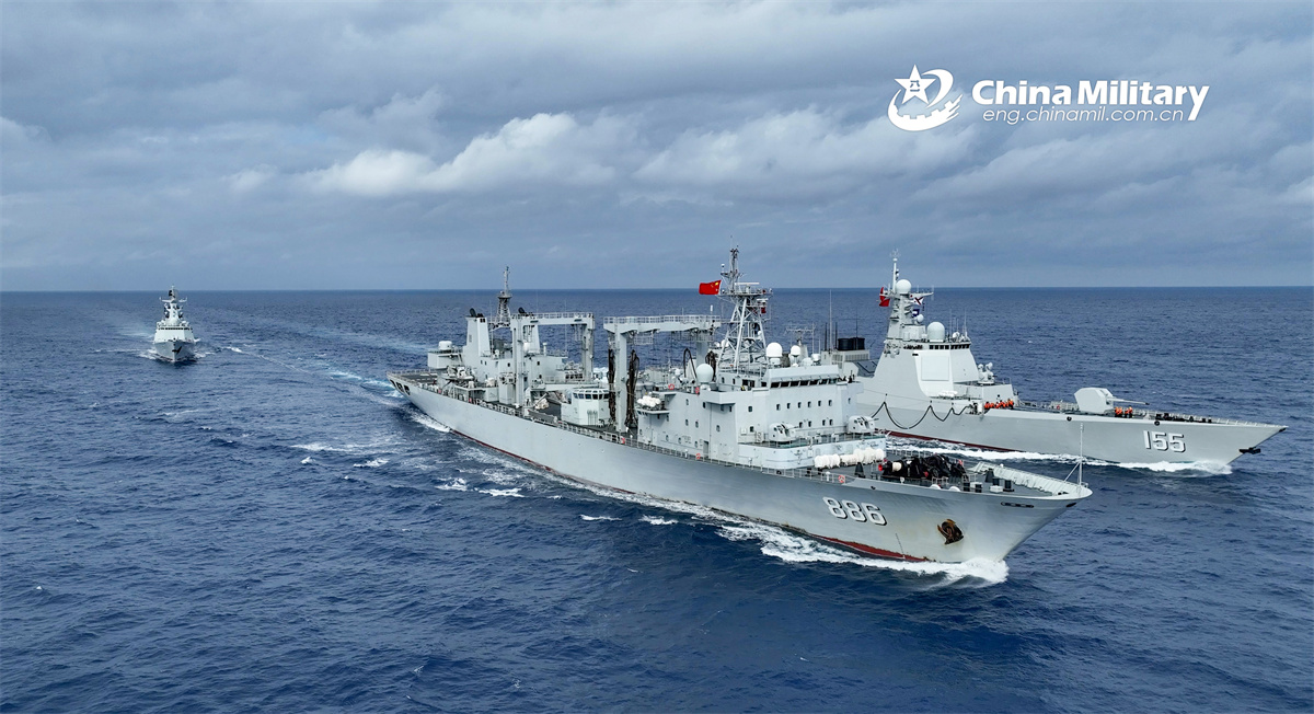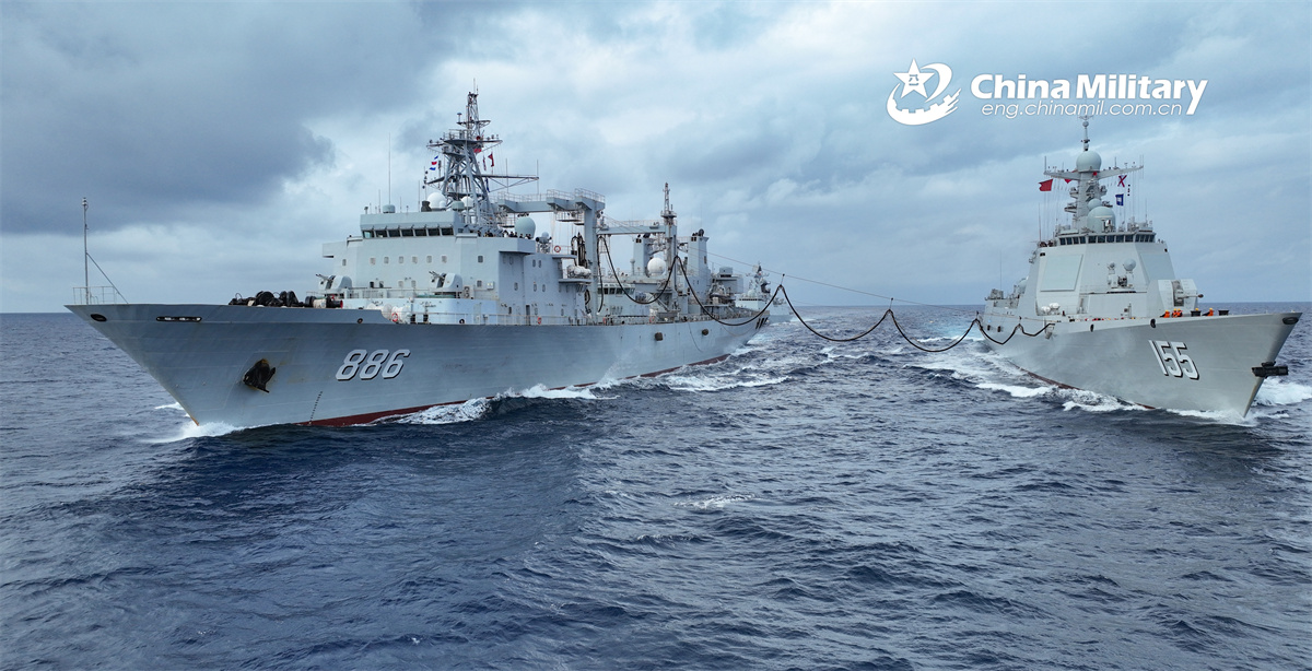 Comprehensive supply ship Qiandaohu (hull 886) and guided-missile destroyer Nanjing (hull 155) attached to a flotilla under the Chinese PLA Navy conduct alongside replenishment at sea during a training exercise on March 4, 2025. (eng.chinamil.com.cn/Photo by Liu Bo)