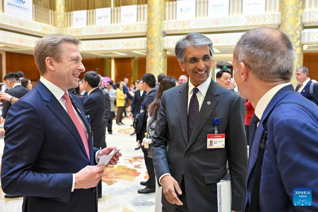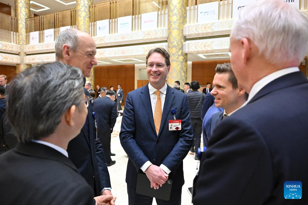 Participants talk before the opening ceremony of the China Development Forum 2025 in Beijing, capital of China, March 23, 2025. The China Development Forum 2025 is scheduled from March 23 to 24. The theme of this year's forum is "Unleashing Development Momentum for Stable Growth of Global Economy." (Xinhua/Li Xin)