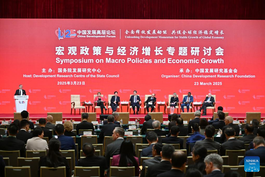 This photo taken on March 23, 2025 shows the Symposium on Macro Policies and Economic Growth of the China Development Forum 2025 in Beijing, capital of China. The China Development Forum 2025 is scheduled from March 23 to 24. The theme of this year's forum is "Unleashing Development Momentum for Stable Growth of Global Economy." (Xinhua/Li Xin)
