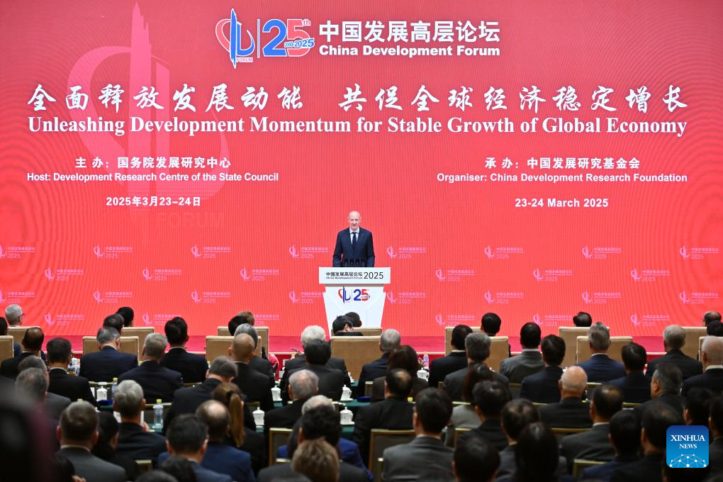 Co-Chair of the China Development Forum (CDF) 2025 and Siemens AG president and CEO Roland Busch speaks during the opening ceremony of the CDF 2025 in Beijing, capital of China, March 23, 2025. The China Development Forum 2025 is scheduled from March 23 to 24. The theme of this year's forum is "Unleashing Development Momentum for Stable Growth of Global Economy." (Xinhua/Li Xin)