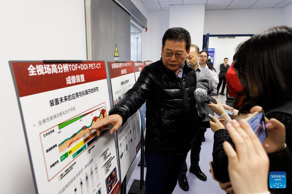 Ren Qiushi (L), professor of Peking University, introduces a multimodal medical imaging device in Beijing, capital of China, March 20, 2025. (Xinhua/Jin Liwang)