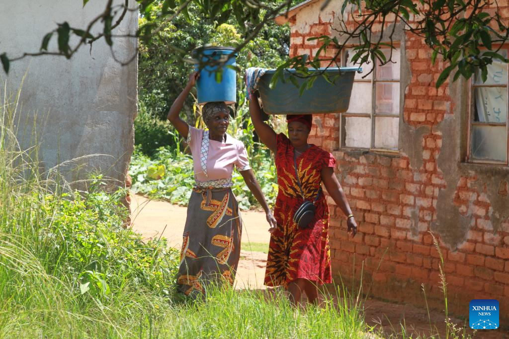 Women carrying water containers on their heads are pictured in Wedza District, Mashonaland East Province, Zimbabwe, March 20, 2025. (Xinhua/Tafara Mugwara)