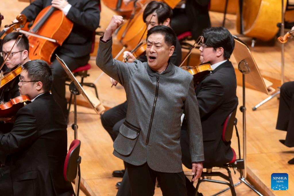Chinese baritone Liao Changyong sings at the opening performance of the 40th Shanghai Spring International Music Festival in Shanghai, east China, March 23, 2025. The opening performance "Maintaining Peace for the Future", a theme concert commemorating the 80th anniversary of the victory of the Chinese People's War of Resistance Against Japanese Aggression and the World Anti-Fascist War, was held at Shanghai Symphony Hall in Shanghai on Sunday. (Xinhua/Wang Xiang)