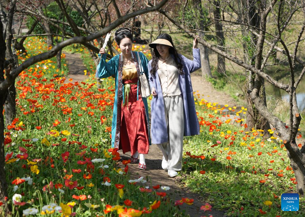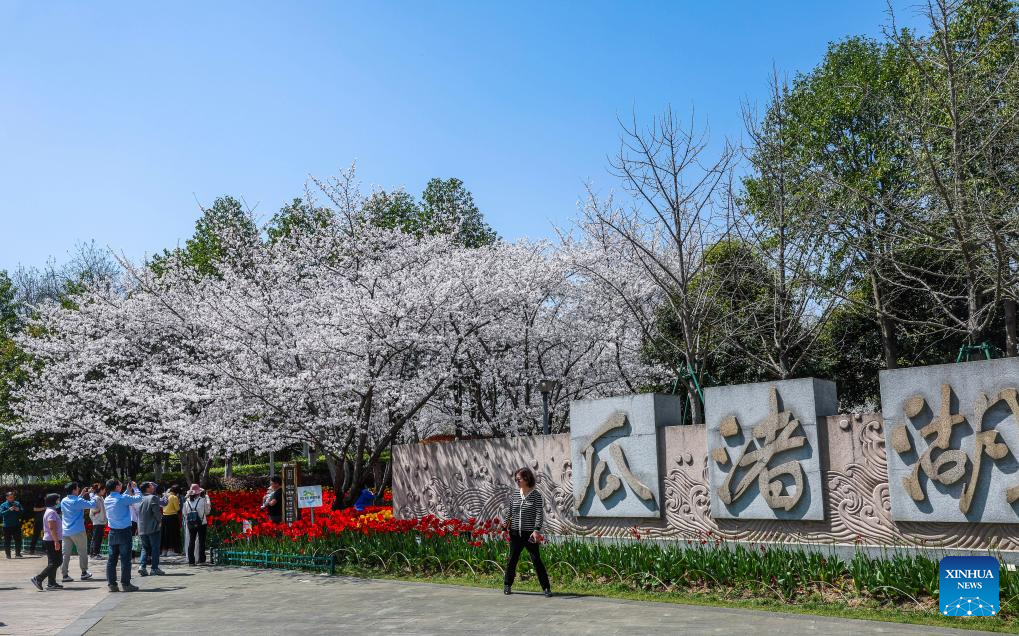 Tourists enjoy leisure time among blooming flowers in Xixi Wetland in Hangzhou, east China's Zhejiang Province, March 24, 2024. (Xinhua/Weng Xinyang)