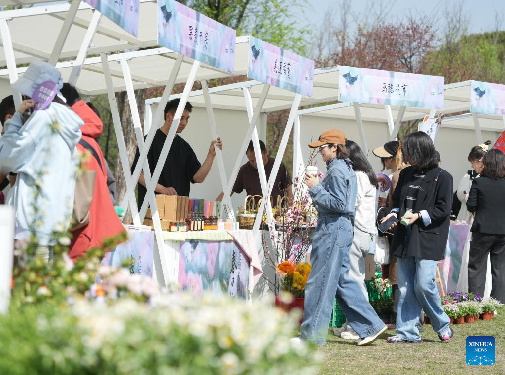 Tourists visit a market in Xixi Wetland in Hangzhou, east China's Zhejiang Province, March 24, 2024. (Xinhua/Weng Xinyang)