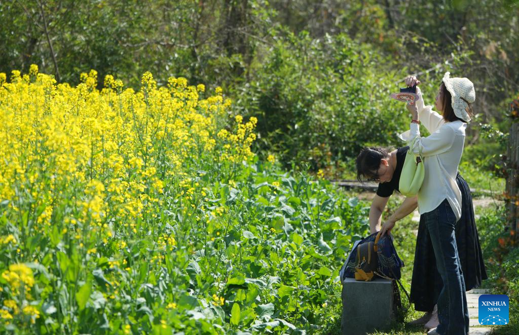 A tourist takes photos of blooming canola flowers in Xixi Wetland in Hangzhou, east China's Zhejiang Province, March 24, 2024. (Xinhua/Weng Xinyang)