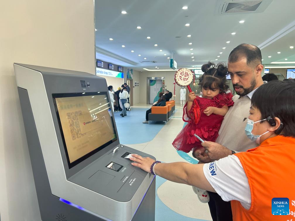 This photo taken with a mobile phone shows a volunteer (R) helping Yemeni businessman Sufyan Marwan Sufyan Mohanmmed take vaccine reservation receipt for his daughter from a machine by scanning a QR code at a community health service center in Yiwu, east China's Zhejiang Province, March 25, 2025. (Xinhua/Huang Xiao)