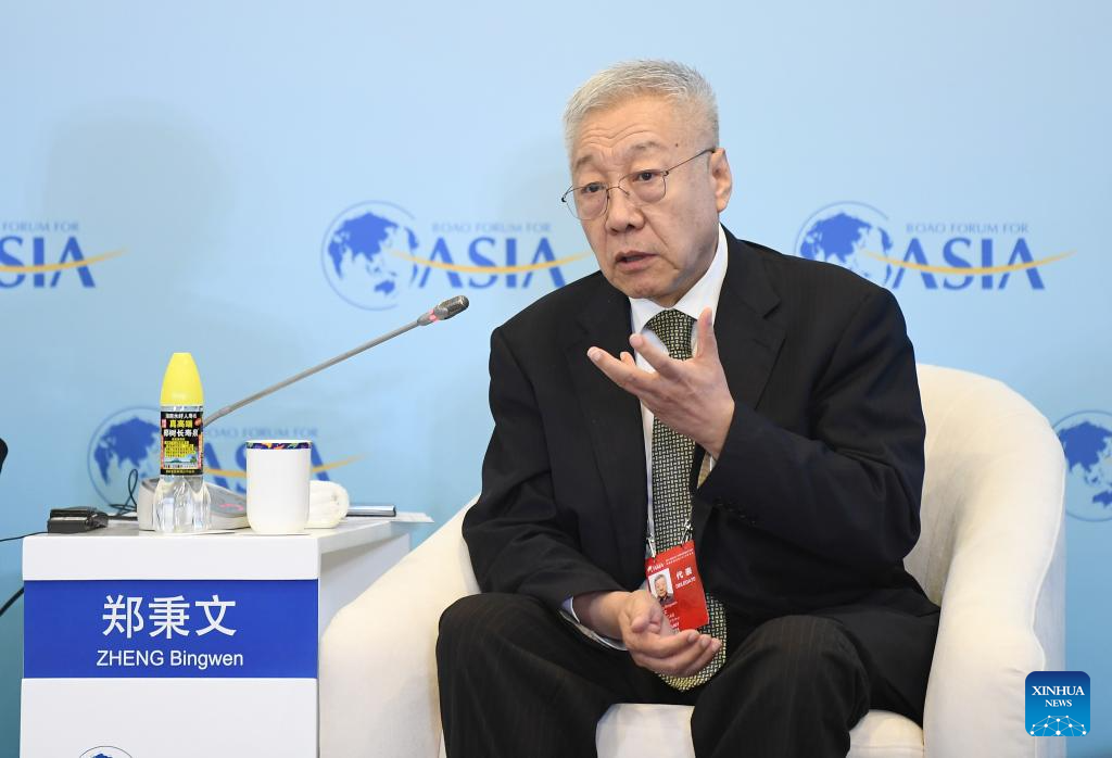 Zheng Bingwen, director-general of Center for International Social Security Studies of Chinese Academy of Social Sciences (CASS), research fellow and ex-director of Institute of American Studies of CASS, speaks at a panel discussion themed on "Pension Reform for Population Aging" during the Boao Forum for Asia (BFA) Annual Conference 2025 in Boao, south China's Hainan Province, March 25, 2025. (Xinhua/Xie Ziyi)