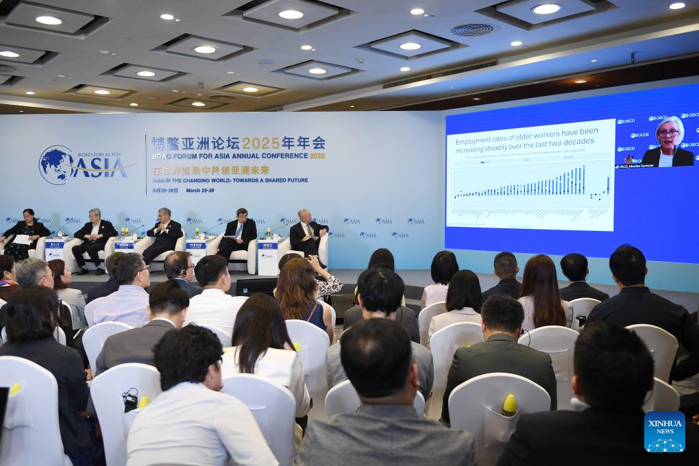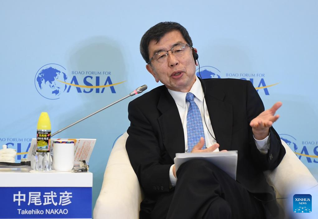 Takehiko Nakao, former president of Asian Development Bank, former Japanese Minister of Finance and chairman of Center for International Economy and Strategy (Tokyo), speaks at a panel discussion themed on "Pension Reform for Population Aging" during the Boao Forum for Asia (BFA) Annual Conference 2025 in Boao, south China's Hainan Province, March 25, 2025. (Xinhua/Xie Ziyi)