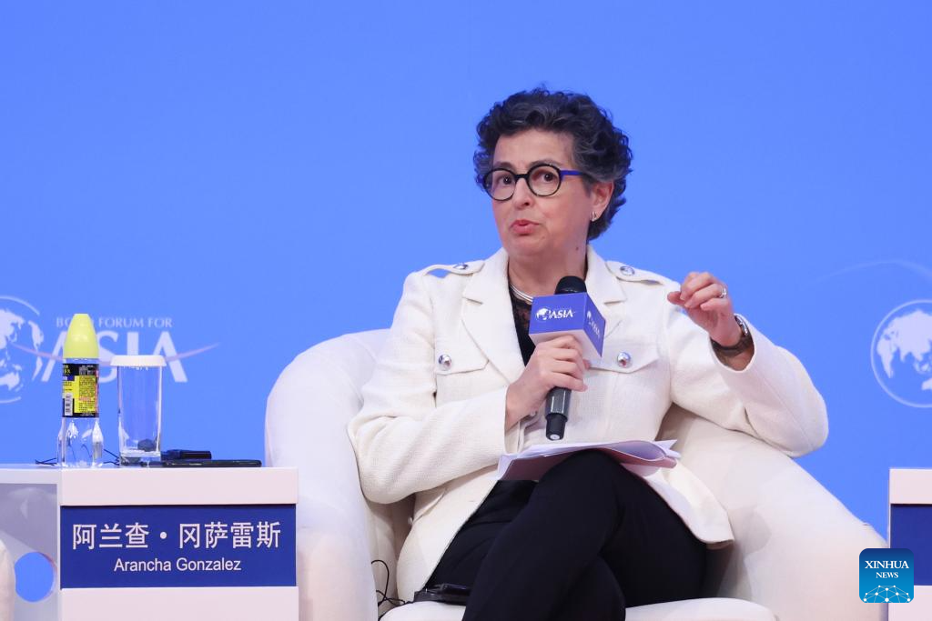 Arancha Gonzalez, former foreign minister of Spain and dean of the Paris School of International Affairs (PSIA) at Sciences Po, speaks at a panel discussion themed on "Global Free Trade Port Development" during the Boao Forum for Asia (BFA) Annual Conference 2025 in Boao, south China's Hainan Province, March 25, 2025. (Xinhua/Zhang Liyun)