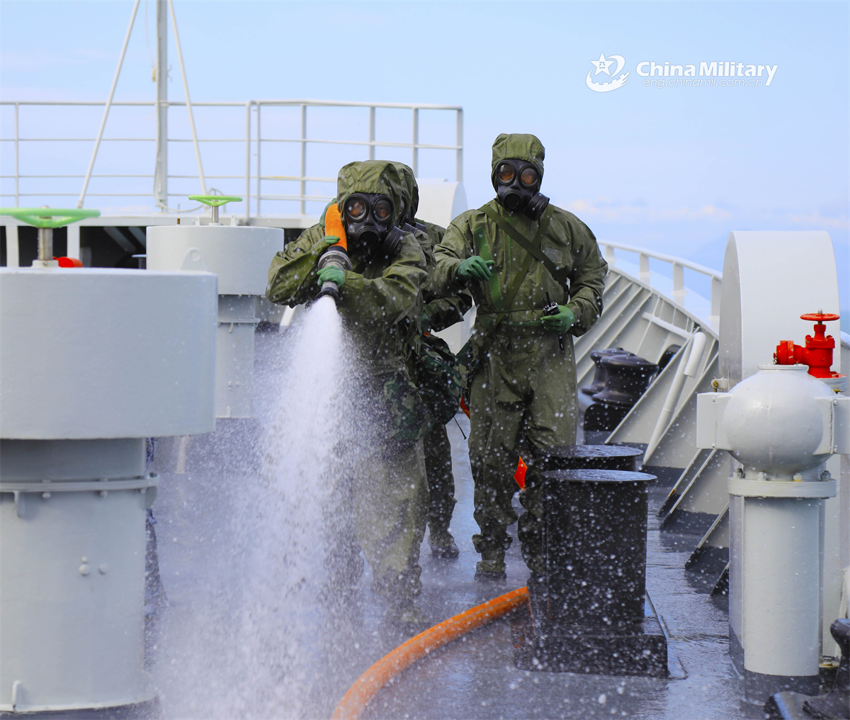 Sailors assigned to a naval service ship group under the Chinese PLA Southern Theater Command conduct decontamination during a maritime combat training exercise in the South China Sea in early March 2025. (eng.chinamil.com.cn/Photo by Wu Huanqing)