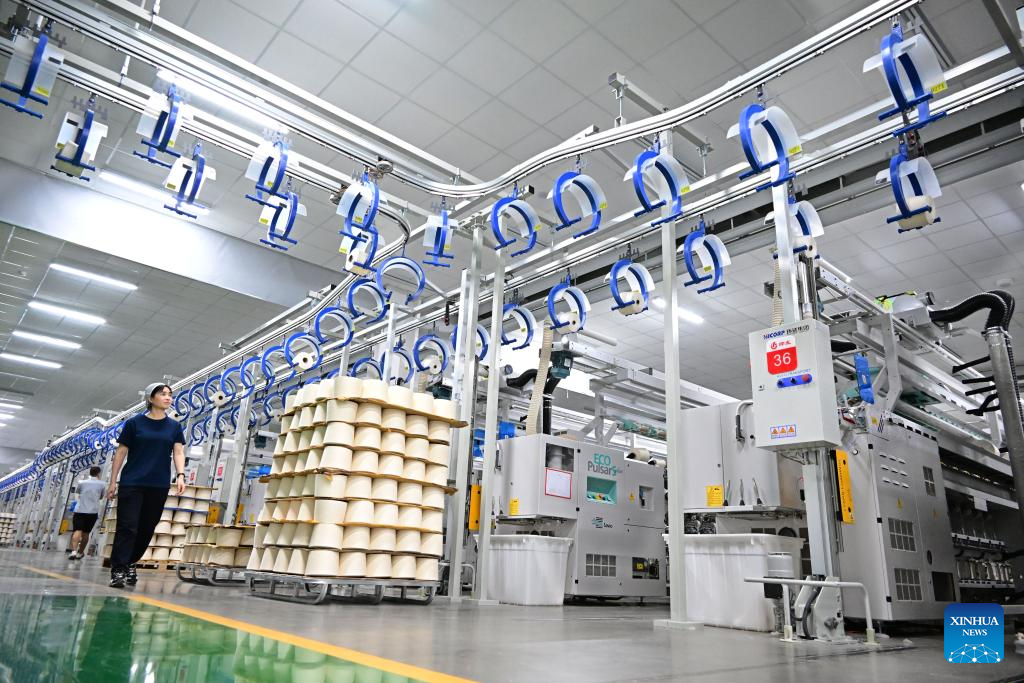 A newly installed automatic lifting and conveying device of a smart spinning enterprise is in trial operation in Jimo District of Qingdao City, east China's Shandong Province, on March 25, 2025. Jimo District of Qingdao City has continuously guided private enterprises to increase R&D and investment in new technologies, new equipment and new processing technology in recent years.