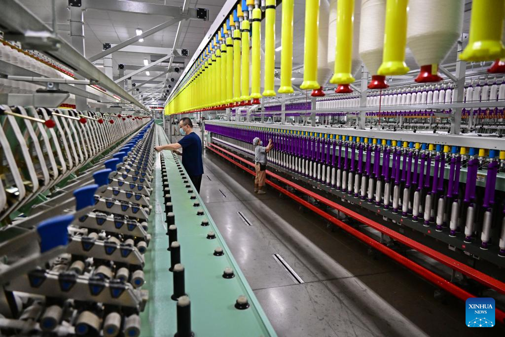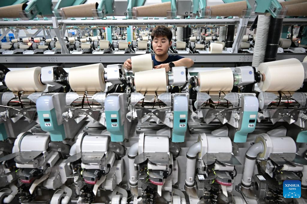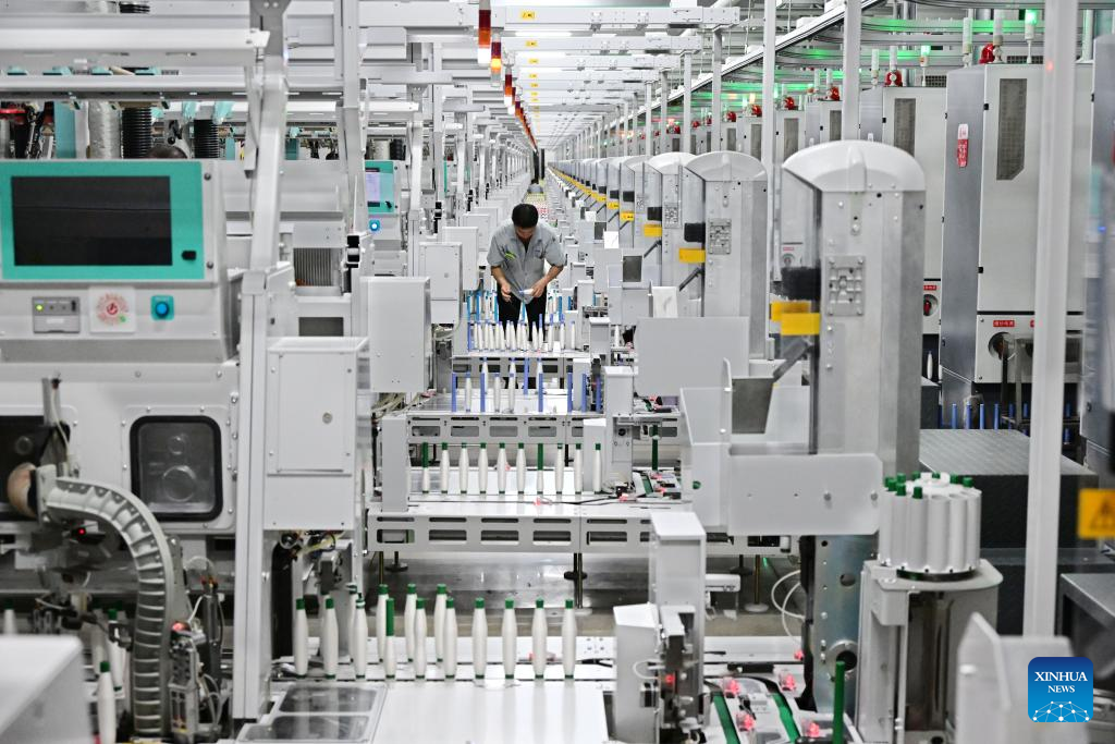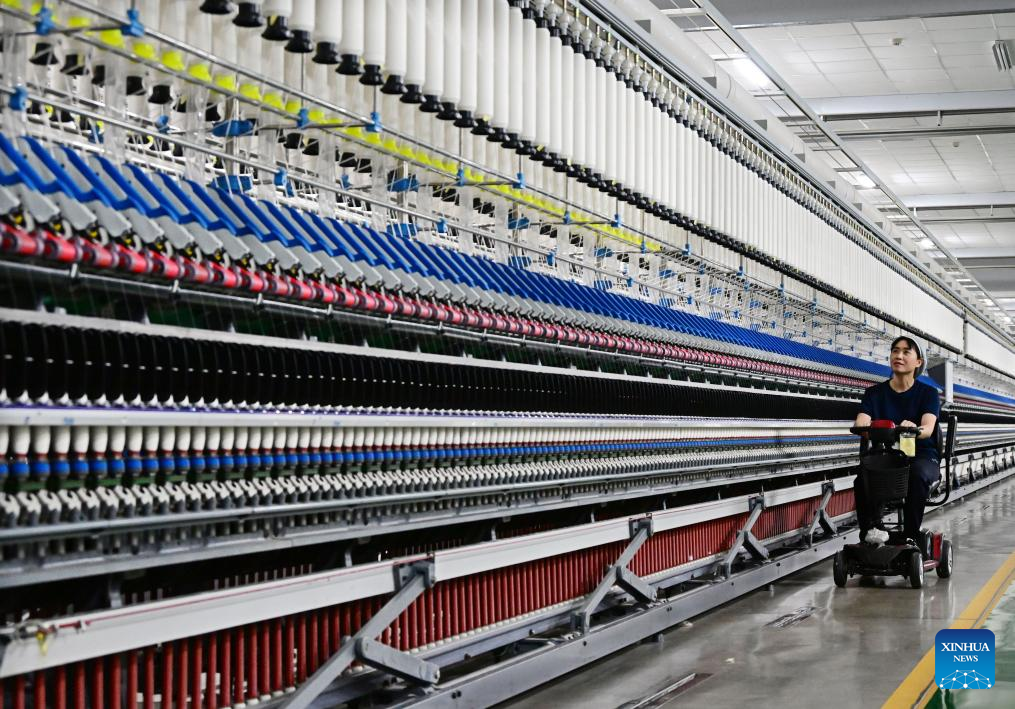 An employee of a smart spinning enterprise works on a fully automatic roving production line in Jimo District of Qingdao City, east China's Shandong Province, on March 25, 2025. Jimo District of Qingdao City has continuously guided private enterprises to increase R&D and investment in new technologies, new equipment and new processing technology in recent years.