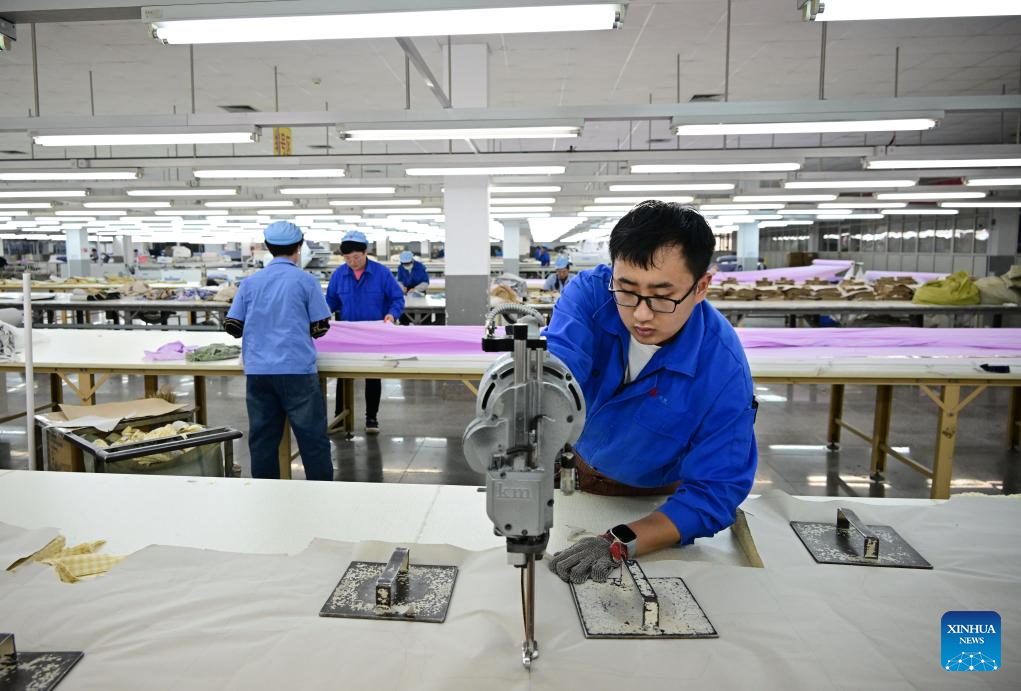 Employees of a garment enterprise in an industrial park use intelligent sewing machines for production in Jimo District of Qingdao City, east China's Shandong Province, on March 25, 2025. Jimo District of Qingdao City has continuously guided private enterprises to increase R&D and investment in new technologies, new equipment and new processing technology in recent years.