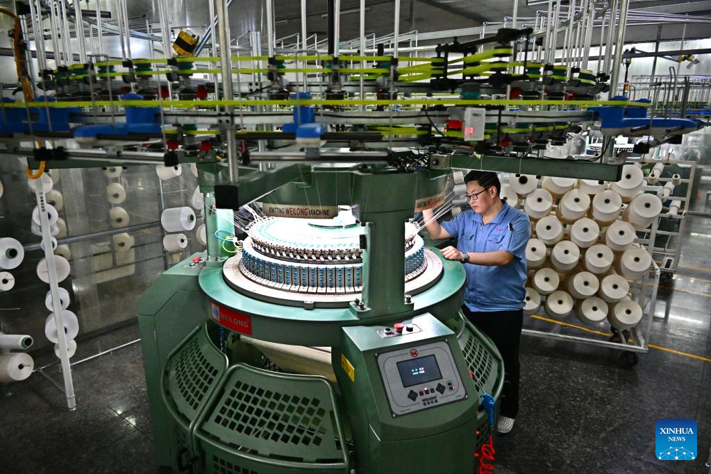 A technician of a smart spinning company maintains an automated circular knitting machine for high-grade fabrics in Jimo District of Qingdao City, east China's Shandong Province, on March 25, 2025. Jimo District of Qingdao City has continuously guided private enterprises to increase R&D and investment in new technologies, new equipment and new processing technology in recent years.