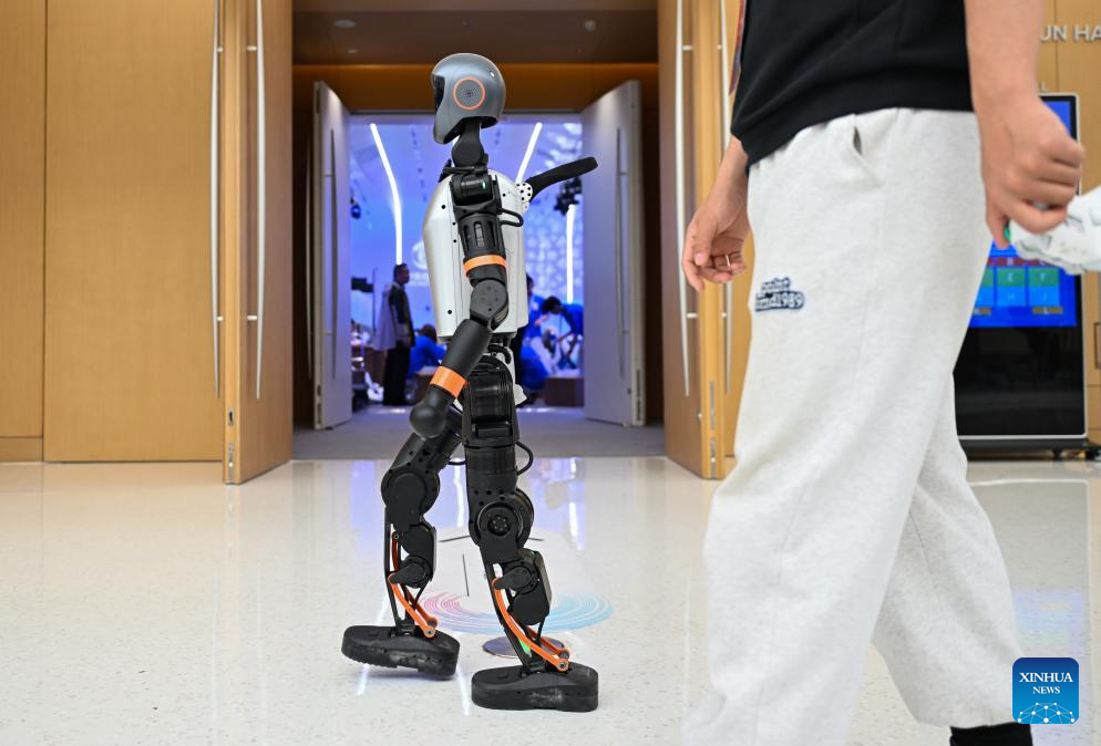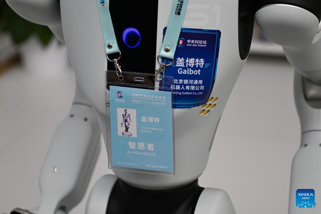 A humanoid robot developed by Beijing Galbot Co., Ltd. with an AI-volunteer card is pictured at Zhongguancun International Innovation Center, venue for the 2025 Zhongguancun Forum (ZGC Forum), in Beijing, capital of China, March 26, 2025. The 2025 ZGC Forum is scheduled to be held in Beijing from March 27 to 31.
