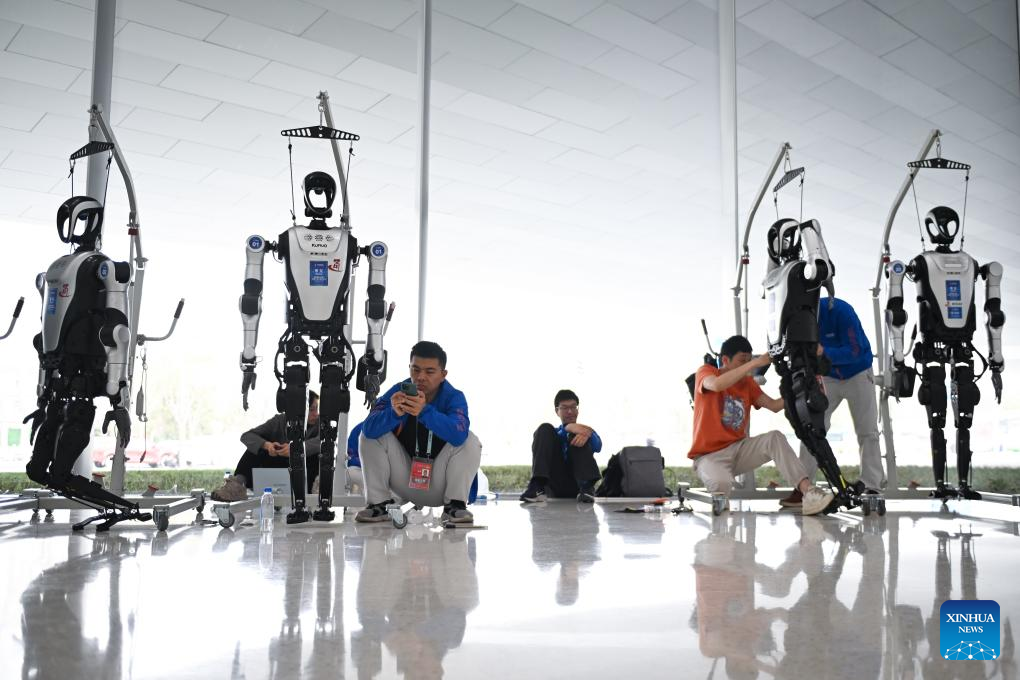 Staff members adjust Kuavo humanoid robots at Zhongguancun International Innovation Center, venue for the 2025 Zhongguancun Forum (ZGC Forum), in Beijing, capital of China, March 26, 2025. The 2025 ZGC Forum is scheduled to be held in Beijing from March 27 to 31.