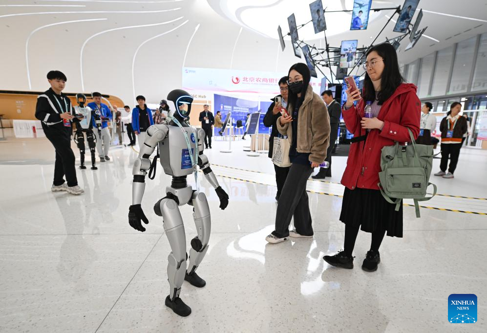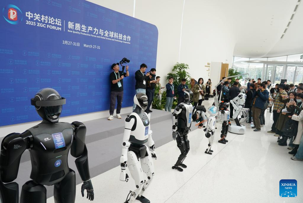 People take photos of a Unitree's G1 humanoid robot at Zhongguancun International Innovation Center, venue for the 2025 Zhongguancun Forum (ZGC Forum), in Beijing, capital of China, March 26, 2025. The 2025 ZGC Forum is scheduled to be held in Beijing from March 27 to 31.
