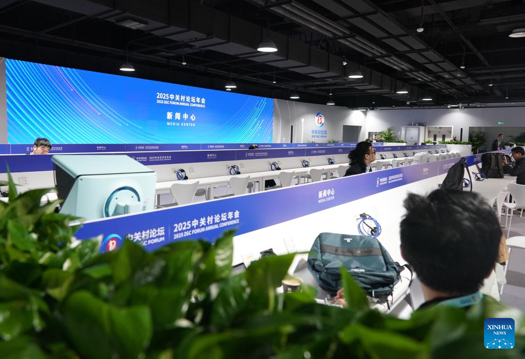 The media center of the 2025 Zhongguancun Forum (ZGC Forum) is pictured in Beijing, capital of China, March 26, 2025. The 2025 ZGC Forum is scheduled to be held in Beijing from March 27 to 31.