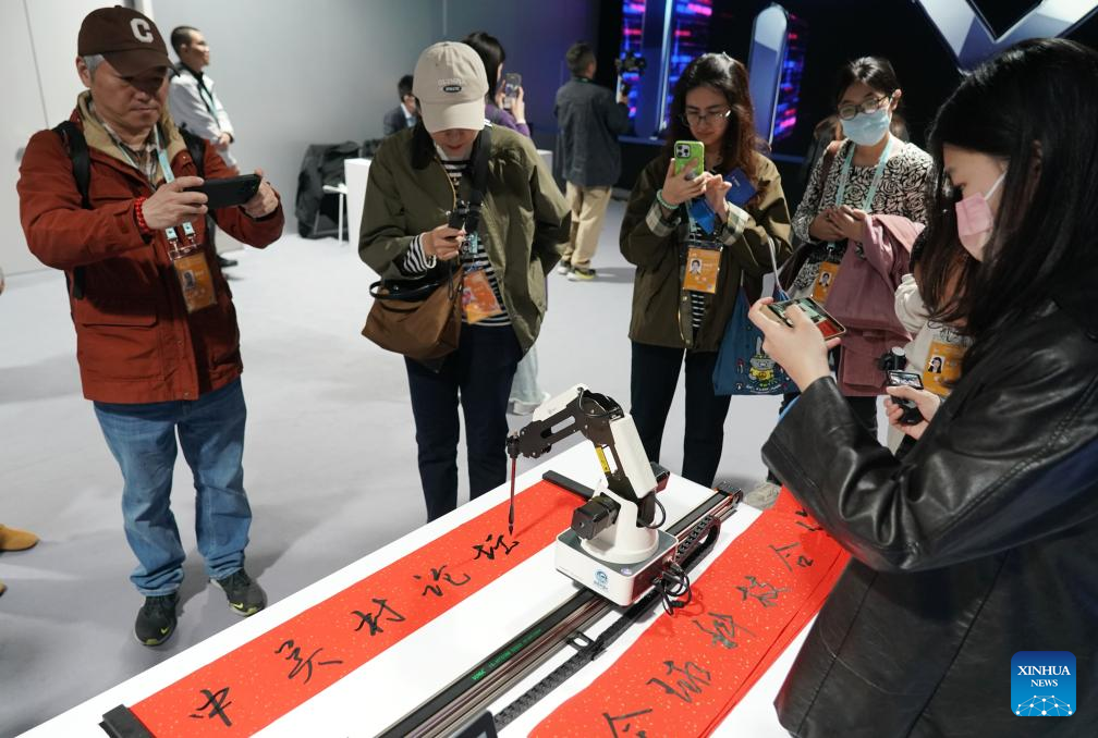 Journalists take photos of a robot writing calligraphy at the media center of the 2025 Zhongguancun Forum (ZGC Forum) in Beijing, capital of China, March 26, 2025. The 2025 ZGC Forum is scheduled to be held in Beijing from March 27 to 31.
