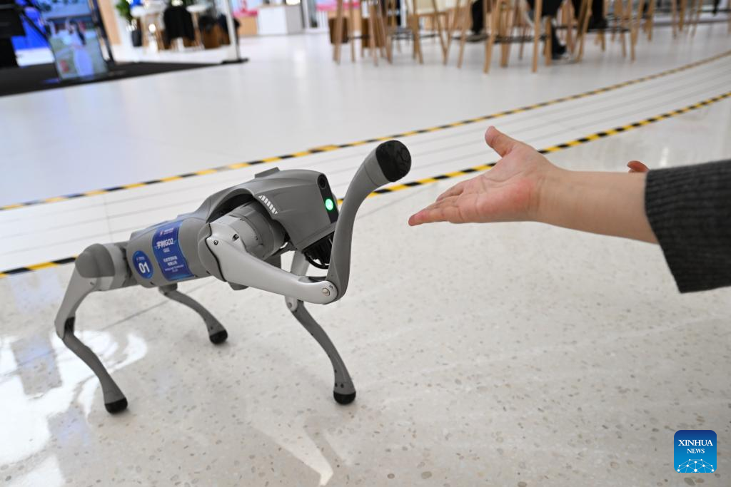 A Unitree GO2 robot dog interacts with a person at Zhongguancun International Innovation Center, venue for the 2025 Zhongguancun Forum (ZGC Forum), in Beijing, capital of China, March 26, 2025. The 2025 ZGC Forum is scheduled to be held in Beijing from March 27 to 31.