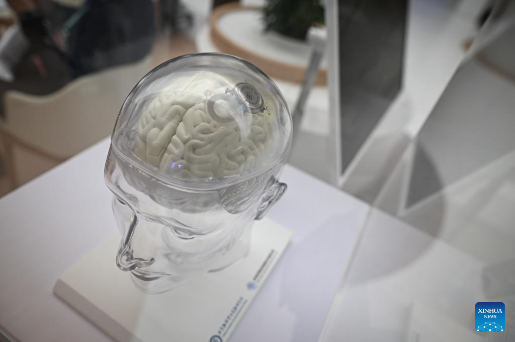 A model of a semi-invasive brain-machine interface (BMI) is displayed at Zhongguancun International Innovation Center, venue for the 2025 Zhongguancun Forum (ZGC Forum), in Beijing, capital of China, March 26, 2025. The 2025 ZGC Forum is scheduled to be held in Beijing from March 27 to 31.