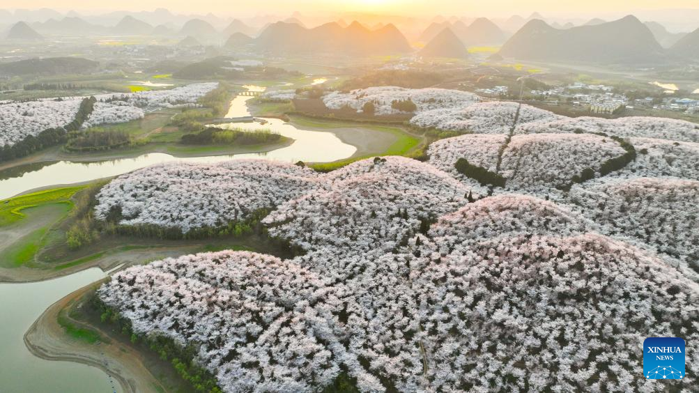 An aerial drone photo taken on March 25, 2025 shows a view of a cherry garden in Gui'an New Area, southwest China's Guizhou Province. Recently, the 10,000 mu of cherry trees in Gui'an New Area have been in full bloom, attracting many tourists to come and enjoy the spring time.