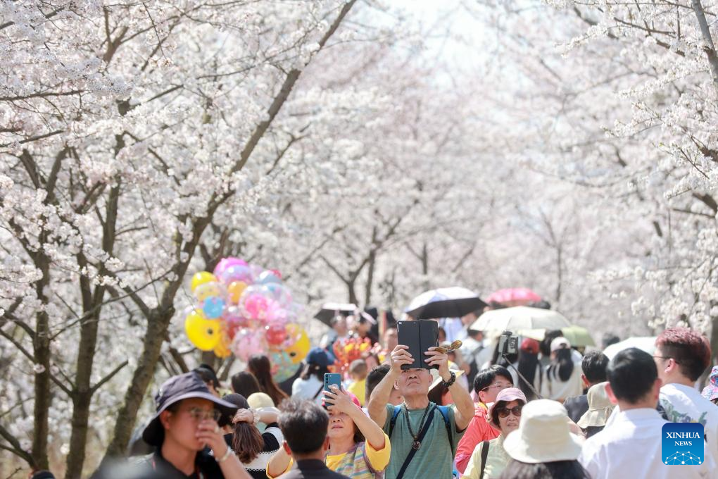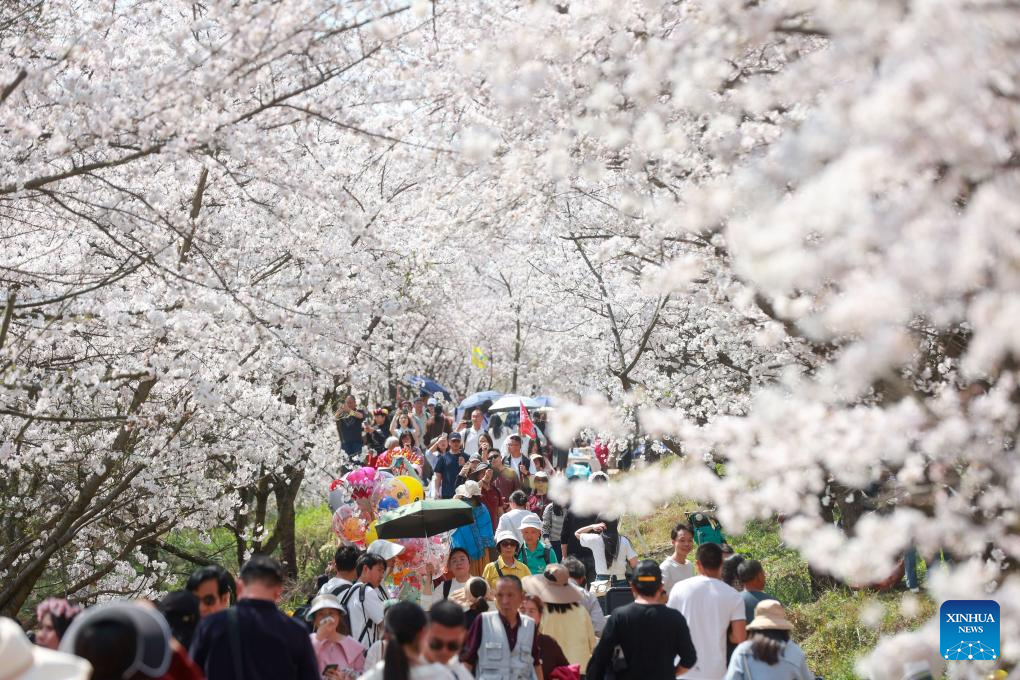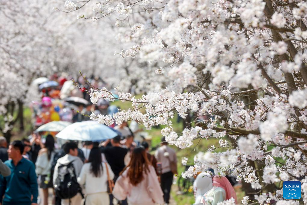 Tourists view cherry blossoms at a cherry garden in Gui'an New Area, southwest China's Guizhou Province, March 25, 2025. Recently, the 10,000 mu of cherry trees in Gui'an New Area have been in full bloom, attracting many tourists to come and enjoy the spring time.