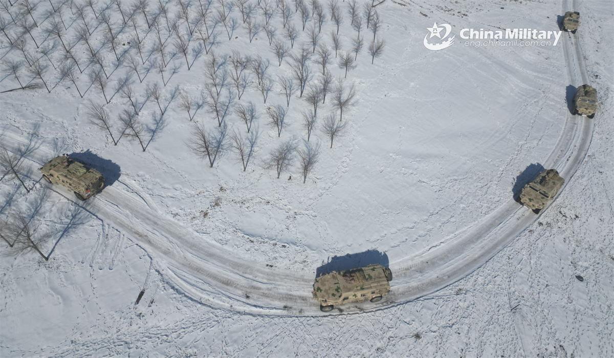 Infantry fighting vehicles attached to a reconnaissance detachment of a regiment under the Chinese PLA Xinjiang Military Command maneuver in the snowfield during a multi-subject training exercise on February 24, 2025. (eng.chinamil.com.cn/Zhang Shihong)