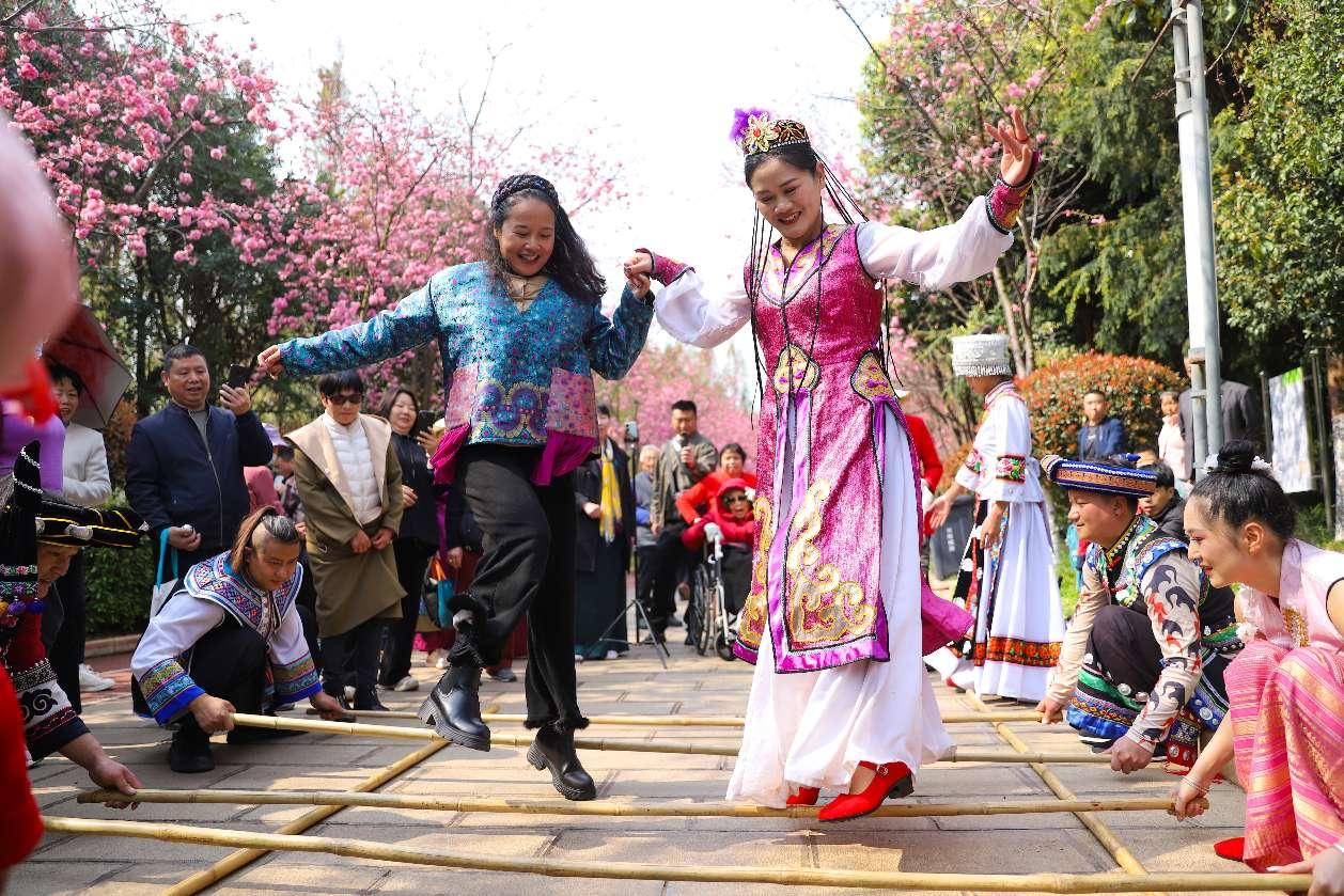 Tourists join a bamboo pole dance in a park in Kunming, southwest China's Yunnan province. (People's Daily Online/Li Faxing)