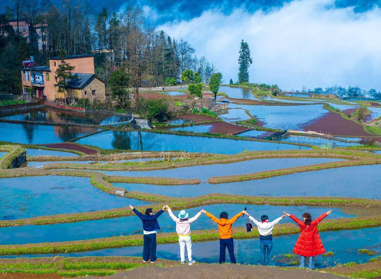 Tourists strike a pose against a backdrop of Hani rice terraces in Honghe Hani and Yi autonomous prefecture, southwest China's Yunnan province. (People's Daily Online/Zhao Zhigeng)