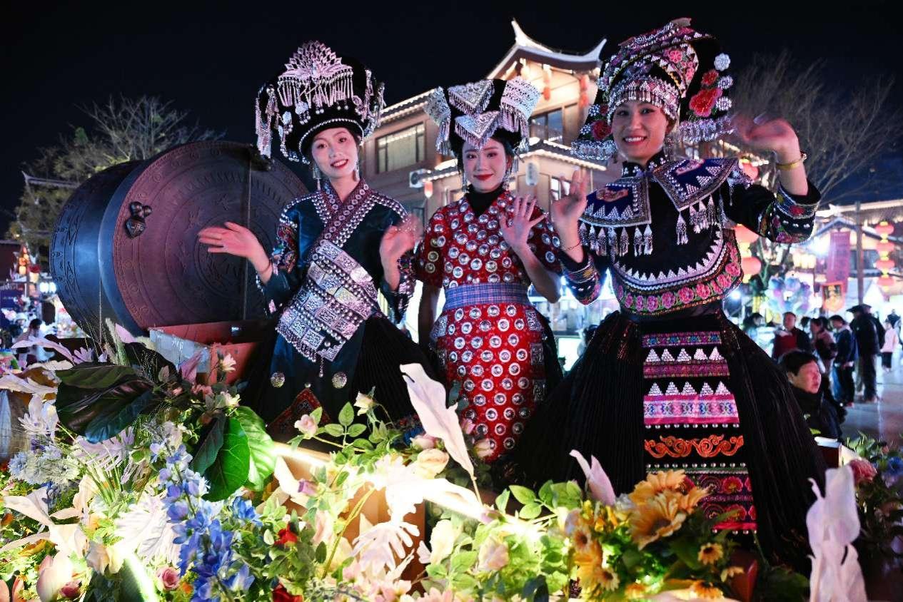 Performers strike a pose against a backdrop of an ancient town in Wenshan Zhuang and Miao autonomous prefecture, southwest China's Yunnan province, Jan. 30, 2025. (People's Daily Online/Xiong Pingxiang)
