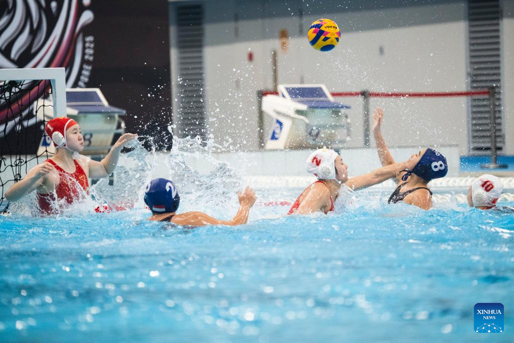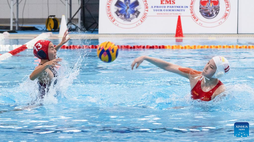 Zhao Xinyi (R) of China shoots during the women's round robin round 1 match between China and Singapore of Asian Water Polo Championship U20 2025 held in Singapore, March 27, 2025. (Photo by Then Chih Wey/Xinhua)