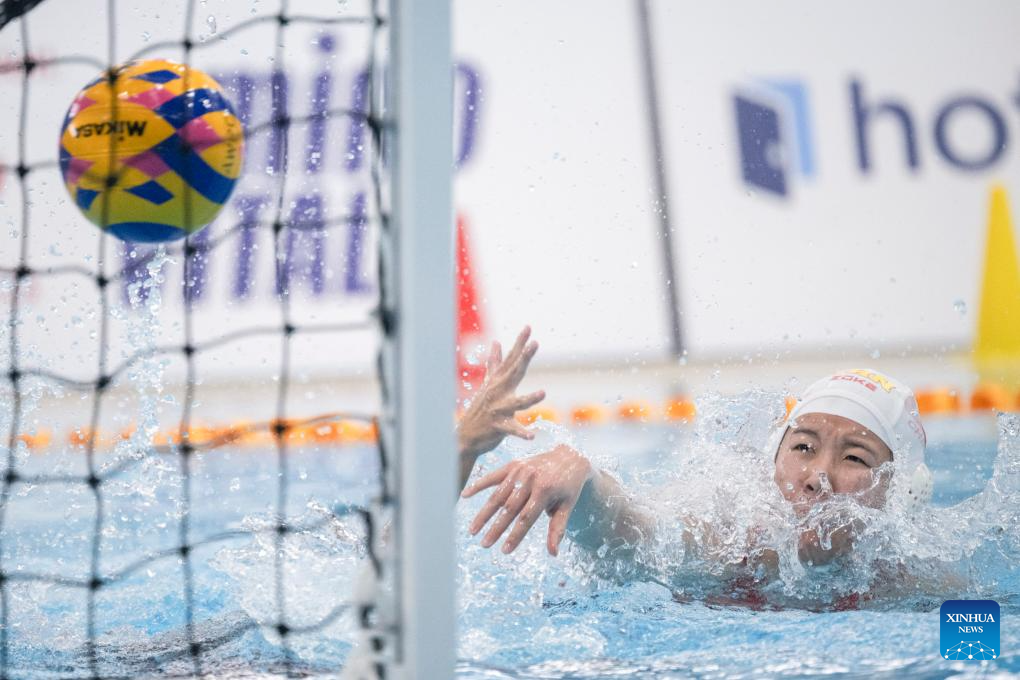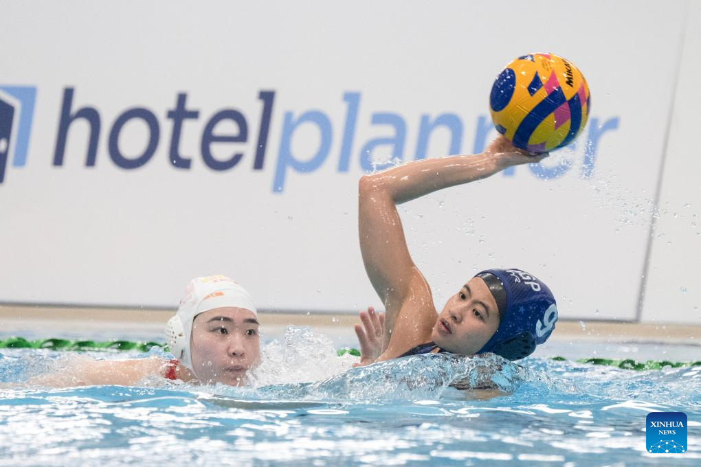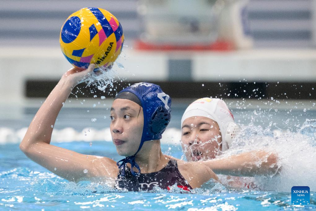 Zou Yuhe of China shoots to score during the women's round robin round 1 match between China and Singapore of Asian Water Polo Championship U20 2025 held in Singapore, March 27, 2025. (Photo by Then Chih Wey/Xinhua)