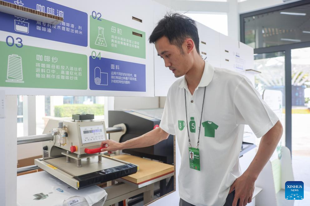 A staff member demonstrates the production of low-carbon "coffee shirts" during the Boao Forum for Asia (BFA) Annual Conference 2025 in Boao, south China's Hainan Province, March 25, 2025. Since its formal inauguration in 2001, the BFA has served as a key platform for the advancement of green development across Asia, facilitating the exchange of insights to promote sustainable growth in the region and beyond.