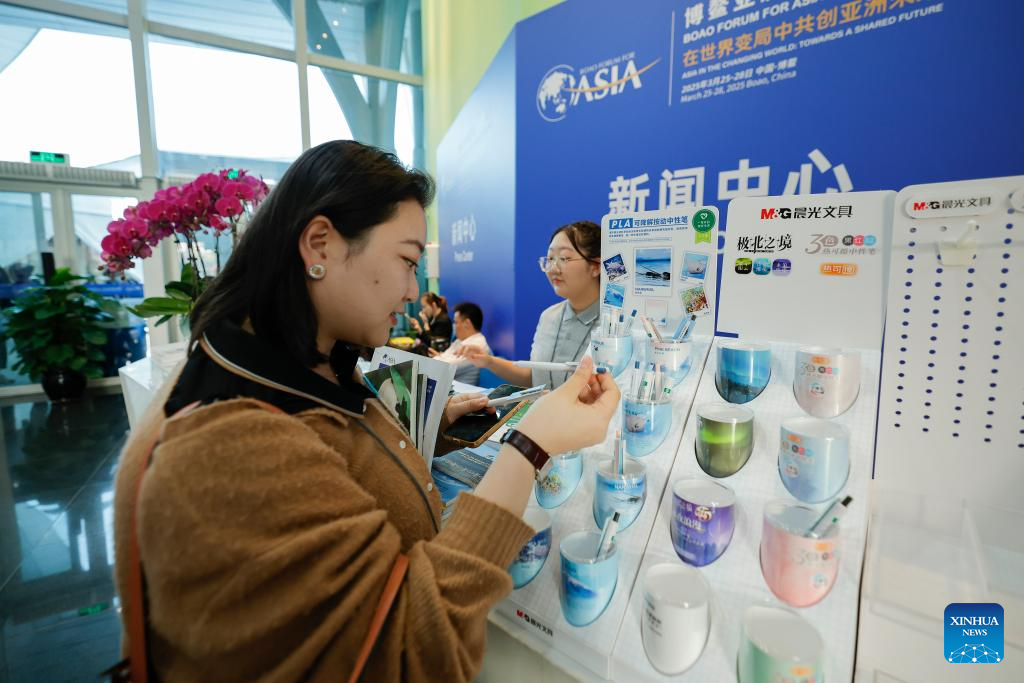 A media worker collects a biodegradable ballpoint pen at the press center during the Boao Forum for Asia (BFA) Annual Conference 2025 in Boao, south China's Hainan Province, March 26, 2025. Since its formal inauguration in 2001, the BFA has served as a key platform for the advancement of green development across Asia, facilitating the exchange of insights to promote sustainable growth in the region and beyond.