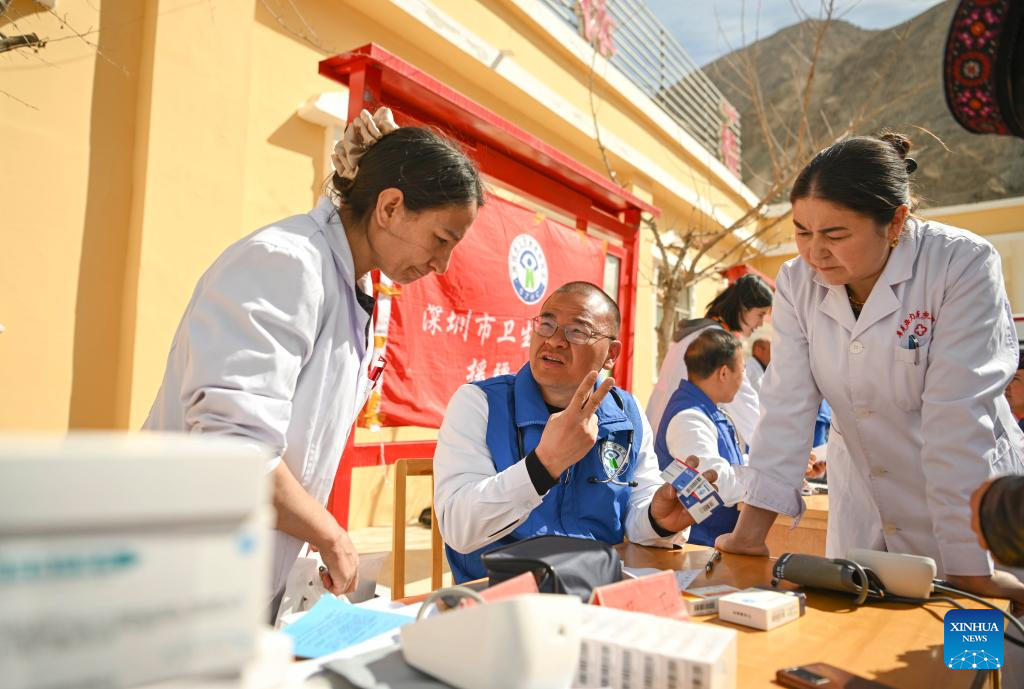 Huang Weichao (2nd L), a physician from Shenzhen, measures the blood pressure for a villager at Kukexiluge health center in Kukexiluge Township, Taxkorgan Tajik Autonomous County, northwest China's Xinjiang Uygur Autonomous Region, March 24, 2025. (Xinhua/Xu Hongyan)