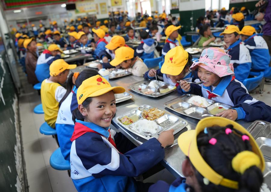 Students have lunch at the Central Primary School in Nyangpo Township of Gongbo'Gyamda County, Nyingchi City, southwest China's Xizang Autonomous Region, Sept. 3, 2024. (Xinhua/Jigme Dorje)