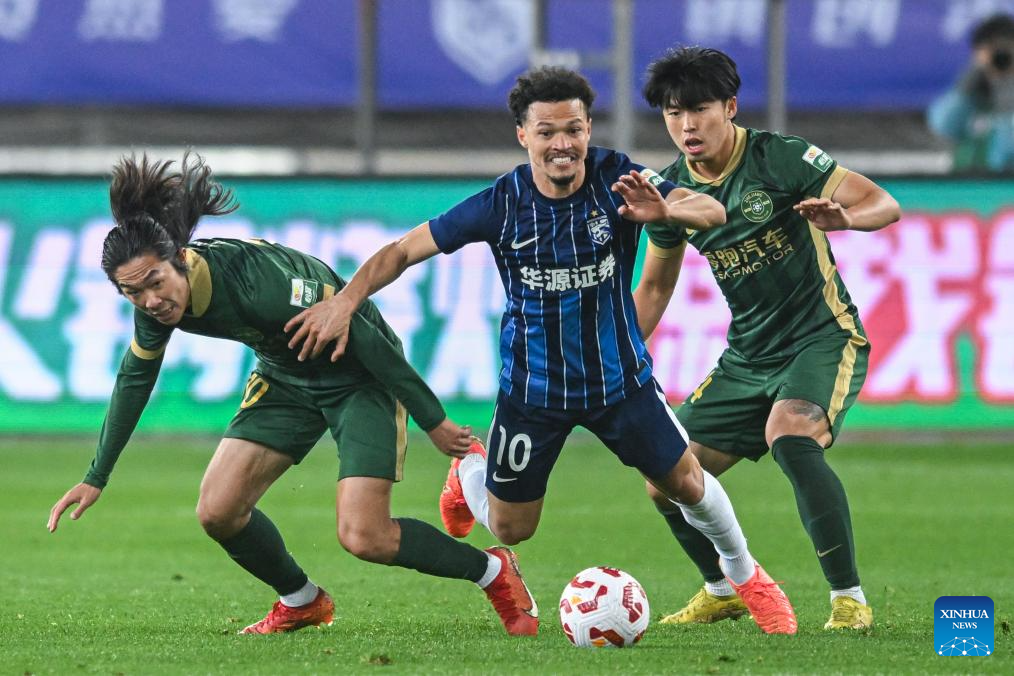 Darlan (2nd R) of Wuhan Three Towns FC breaks through during the 3rd round match between Wuhan Three Towns FC and Zhejiang Greentown FC at the 2025 season Chinese Football Super League (CSL) in Wuhan, central China's Hubei Province, March 28, 2025. (Xinhua/Cheng Min)