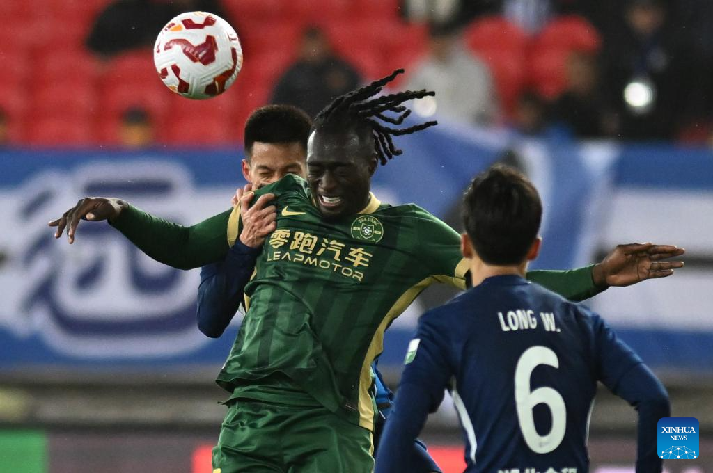 Deabeas Owusu-Sekyere (C) of Zhejiang Greentown FC vies for a header during the 3rd round match between Wuhan Three Towns FC and Zhejiang Greentown FC at the 2025 season Chinese Football Super League (CSL) in Wuhan, central China's Hubei Province, March 28, 2025. (Xinhua/Cheng Min)