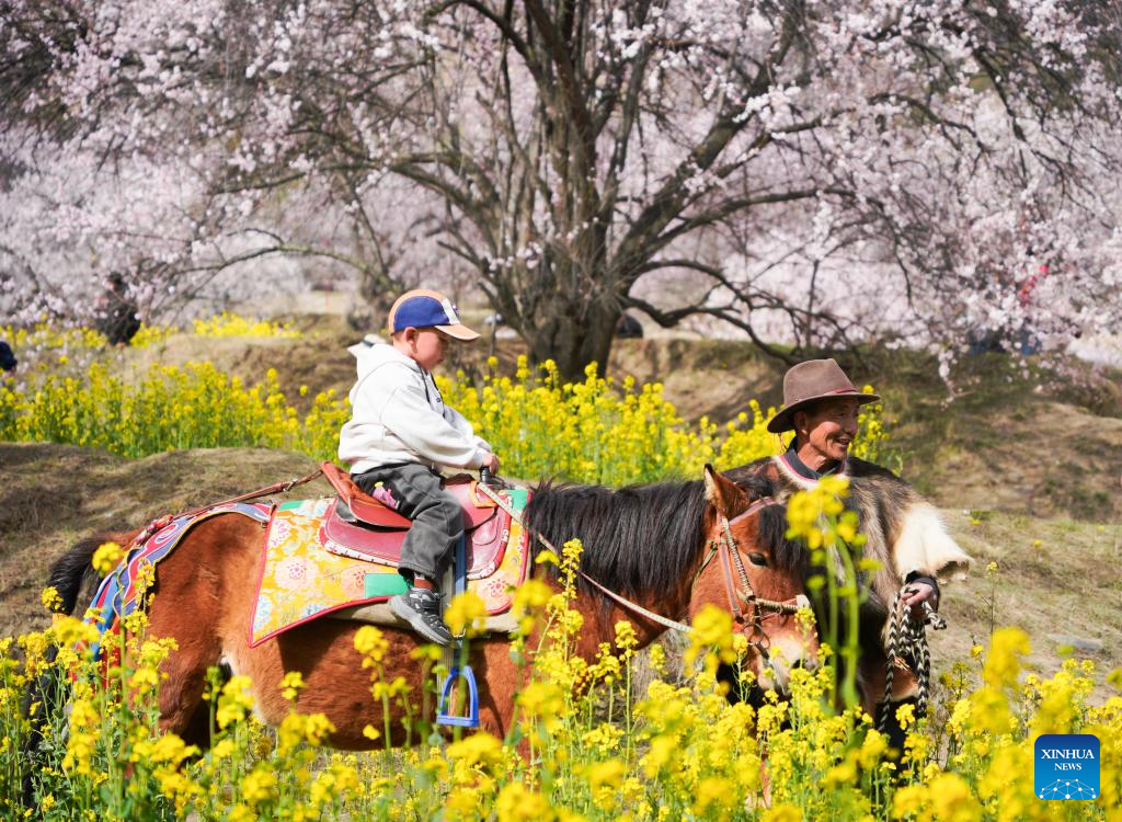 A child rides a horse among blooming flowers in Nyingchi, southwest China's Xizang Autonomous Region, March 29, 2025. As the weather warms up, peach blossoms in Nyingchi are in full bloom, attracting numerous tourists. (Xinhua/Qi Zhiyue)