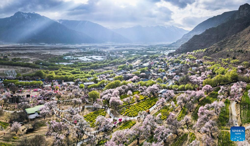 A panoramic drone photo shows peach blossoms in Nyingchi, southwest China's Xizang Autonomous Region, March 29, 2025. As the weather warms up, peach blossoms in Nyingchi are in full bloom, attracting numerous tourists. (Xinhua/Qi Zhiyue)