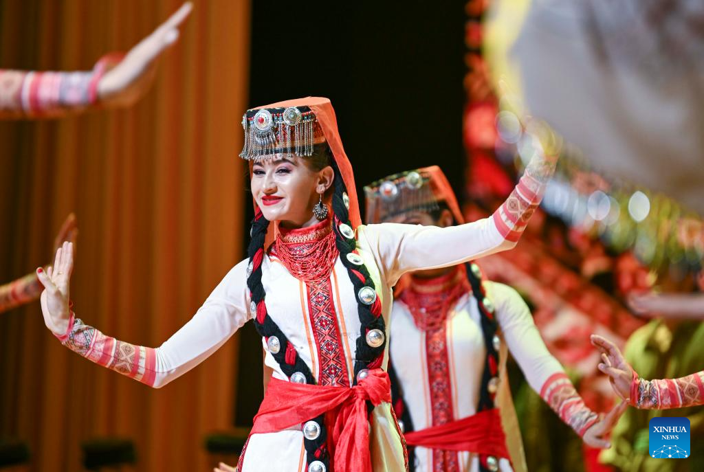 Amangul Wapik participates in the performance of a musical at a performing art center in Taxkorgan Tajik Autonomous County, northwest China's Xinjiang Uygur Autonomous Region, March 22, 2025. (Xinhua/Hu Huhu)