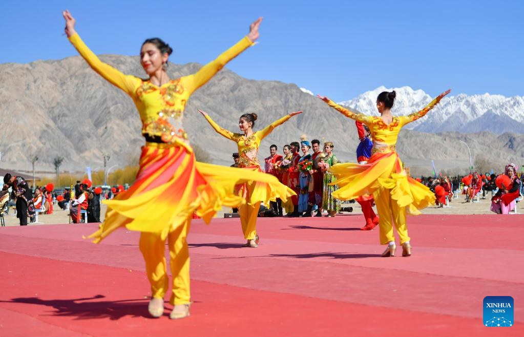 Amangul Wapik (C) and her colleagues stage a performance during a spring tourism activity in Tiznap Town of Taxkorgan Tajik Autonomous County, northwest China's Xinjiang Uygur Autonomous Region, March 23, 2025. (Xinhua/Hu Huhu)