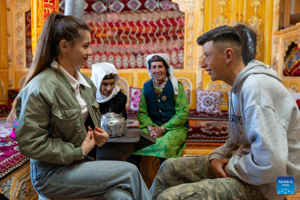 Amangul Wapik (R) and her brother prepare milk tea for guests in Sarijilga Village of Taxkorgan Tajik Autonomous County, northwest China's Xinjiang Uygur Autonomous Region, March 21, 2025. (Xinhua/Hu Huhu)