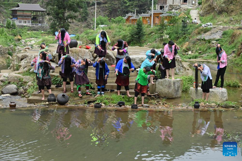 Women wash and comb their hair in Wuying Village on the border between south China's Guangxi Zhuang Autonomous Region and southwest China's Guizhou Province, April 19, 2023. Since 2017, supported by a paired assistance program, local authorities have continuously enhanced the living environment and improved cultural facilities in Wuying Village, aiming to strengthen the inheritance and development of ethnic culture and promote rural revitalization. (Xinhua/Huang Xiaobang)