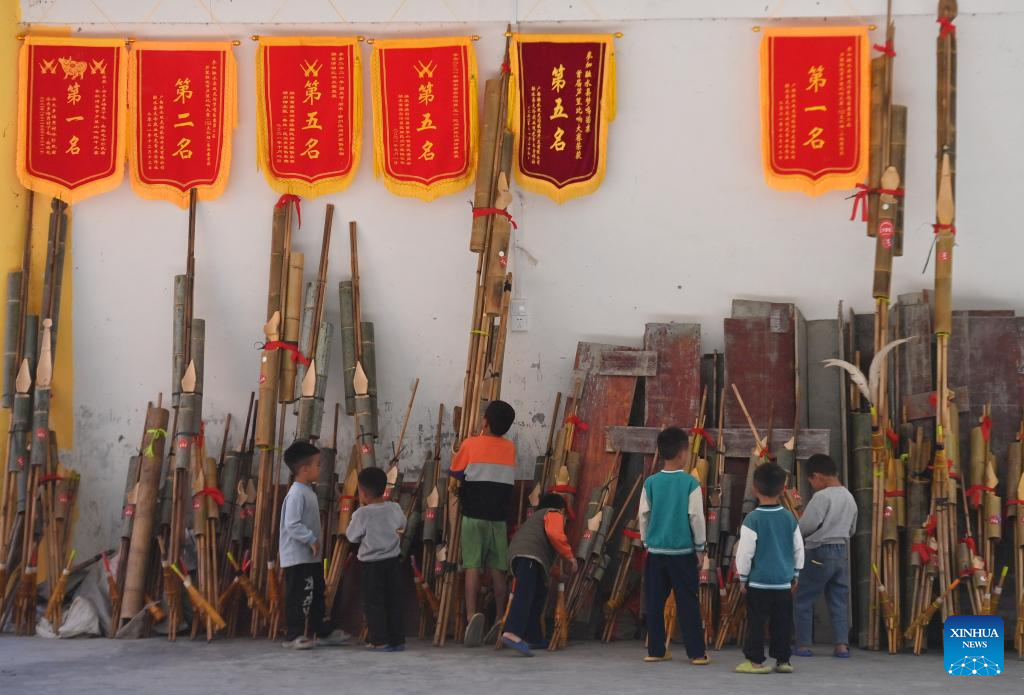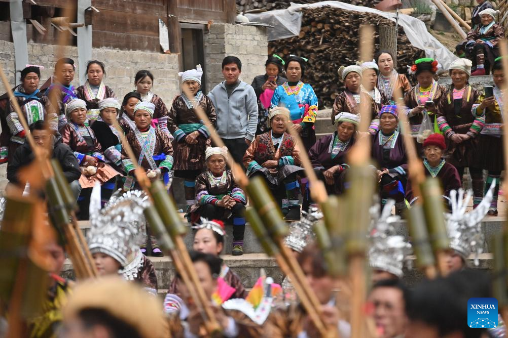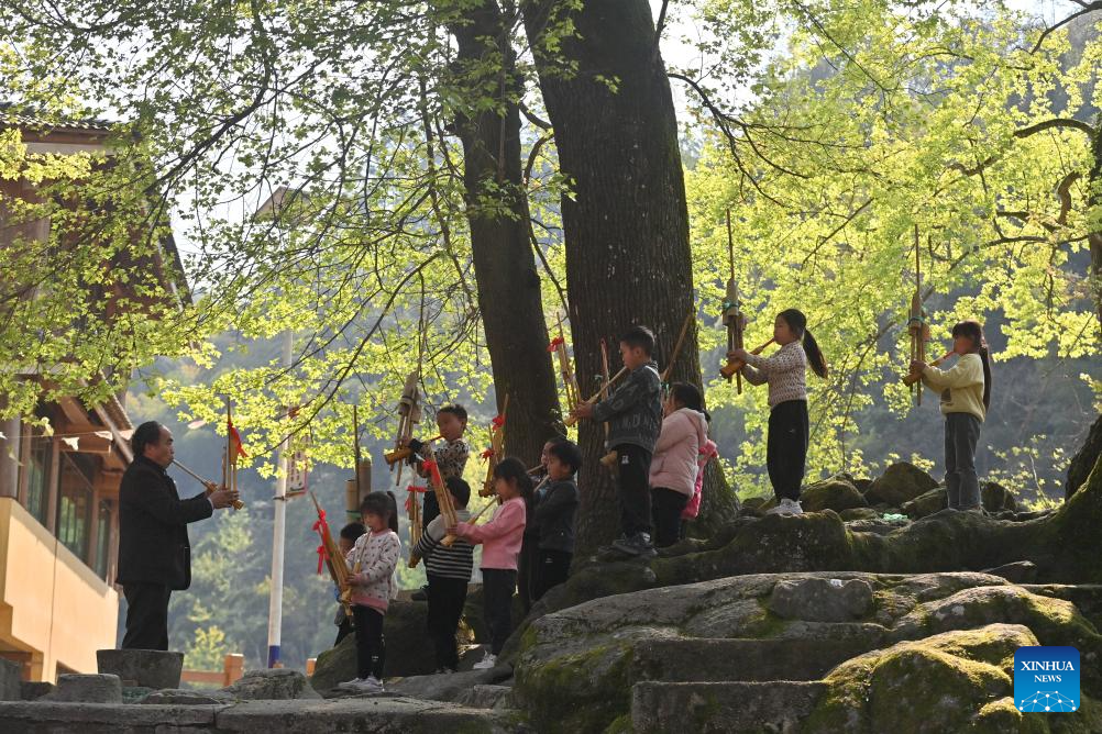 Children practice Lusheng, a traditional reed-pipe wind instrument, in Wuying Village on the border between south China's Guangxi Zhuang Autonomous Region and southwest China's Guizhou Province, March 28, 2025. Since 2017, supported by a paired assistance program, local authorities have continuously enhanced the living environment and improved cultural facilities in Wuying Village, aiming to strengthen the inheritance and development of ethnic culture and promote rural revitalization. (Xinhua/Huang Xiaobang)