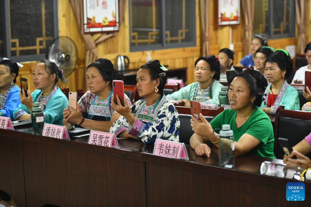 Women sing Miao ethnic songs at a night school in Wuying Village on the border between south China's Guangxi Zhuang Autonomous Region and southwest China's Guizhou Province, Aug. 11, 2020. Since 2017, supported by a paired assistance program, local authorities have continuously enhanced the living environment and improved cultural facilities in Wuying Village, aiming to strengthen the inheritance and development of ethnic culture and promote rural revitalization. (Xinhua/Huang Xiaobang)